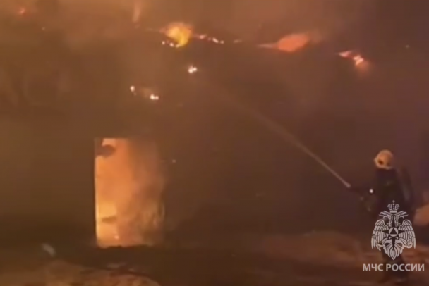 На кадрах с места видно, что огнем охватило здание с вывеской "Колбаса", наружу из него вырываются мощные языки пламени.