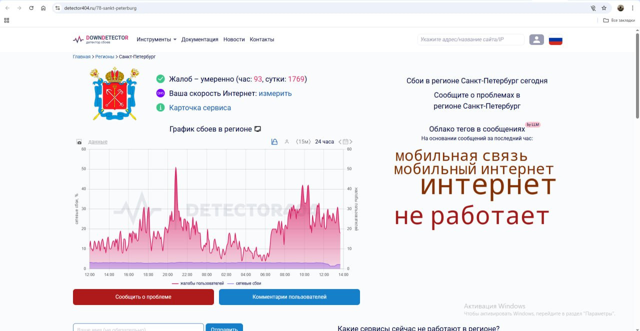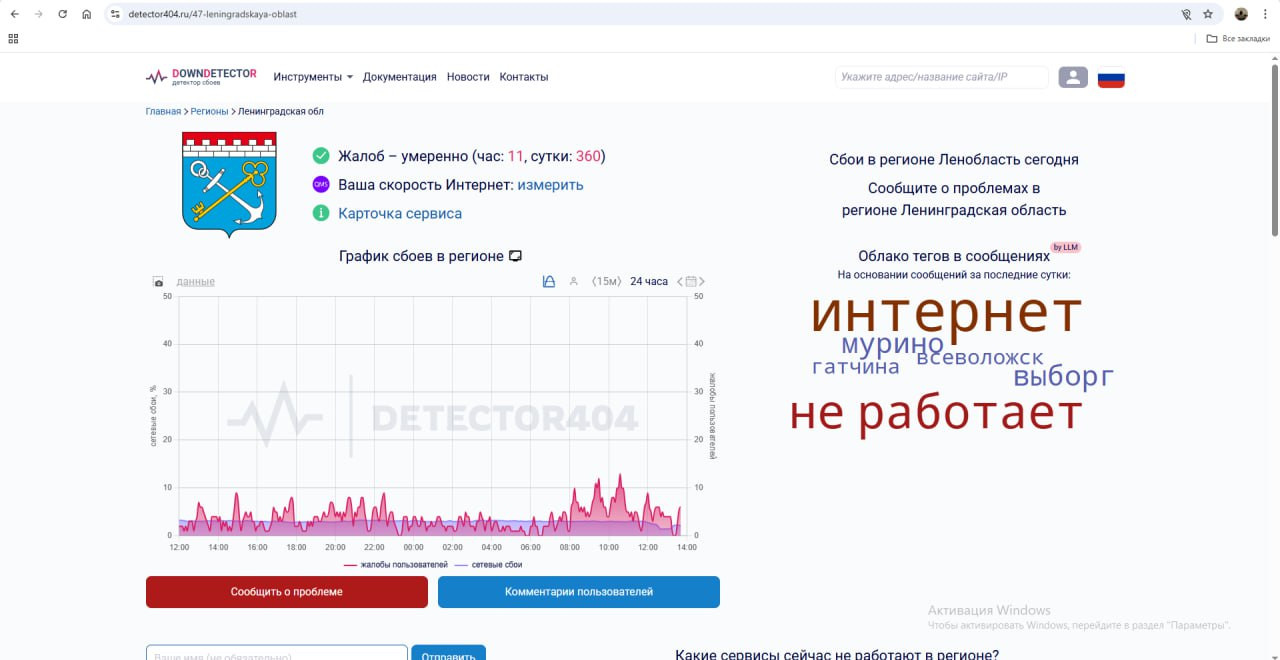 Уточним, что Ленинградской области пока что везет больше. Умеренный всплеск недовольства наблюдался около полудня. Чаще всего пользователи пишут о нарушениях в работе Интернета в Гатчине и Мурино, упоминают и Всеволожск. В Ленобласти первое место в рейтинге сбоев занял Telegram, как и в Петербурге.