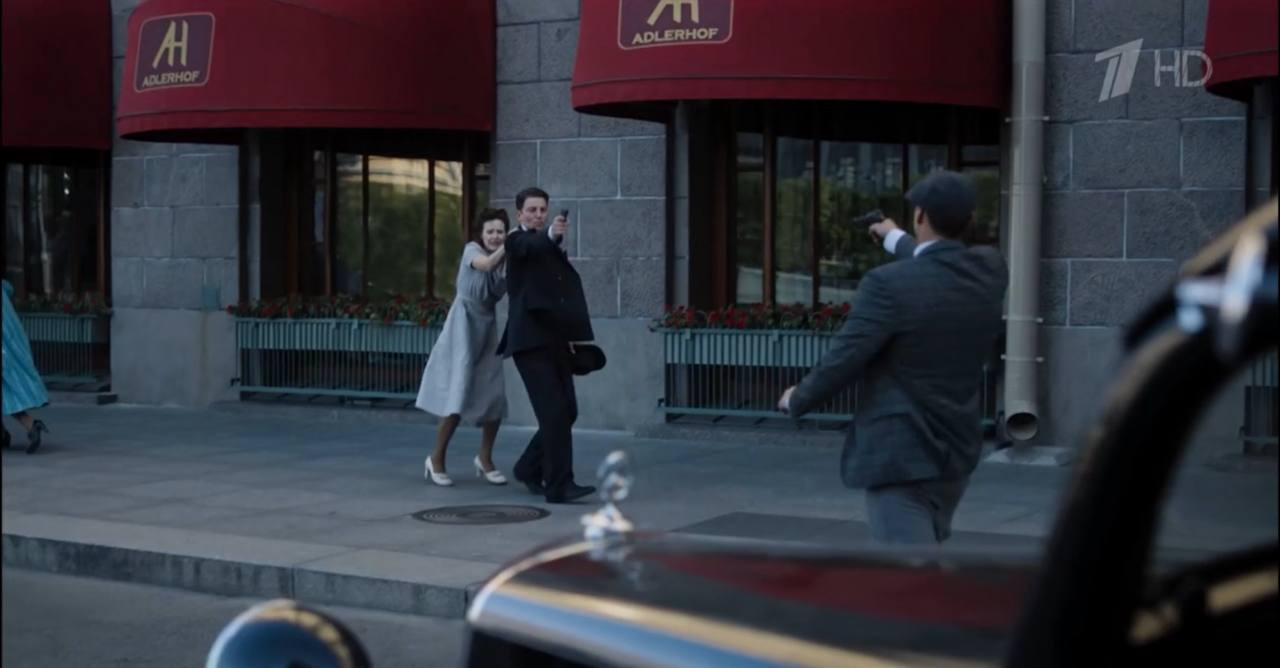 Отметим, что на улице при перестрелке с управляющим отеля можно заметить постеры пропагандистских фильмов. Например, видна афиша ленты знаменитой Der heilige Berg ("Священная гора") с Лени Рифеншталь в главной роли.