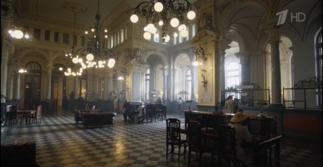 Позже, в контексте стратегического шантажа, в качестве декораций появляется Дом первого общества взаимного кредита. Светлый зал в приглушенном свете, пожалуй, хорошо вписывается в сюжетную линию. Советская разведка в лице завербованного Берга решает надавить на профессора физики, вовлеченного в немецкий атомный проект. Шантажируют его женой-еврейкой – профессор умудрился спрятать ее от Гестапо.