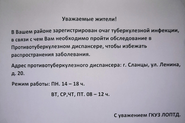 "В вашем районе зарегистрирован очаг туберкулезной инфекции, в связи с чем вам необходимо пройти обследование в Противотуберкулезном диспансере, чтобы избежать распространения заболевания", – говорится в сообщении от имени Ленинградского областного противотуберкулезного диспансера. Указан адрес и режим работы учреждения.