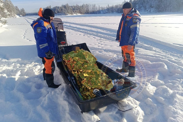 Пострадавшего мужчину вынесли со льда озера в Приозерском районе Ленобласти под спасательным одеялом. Он застрял на льду из-за травмы ноги.