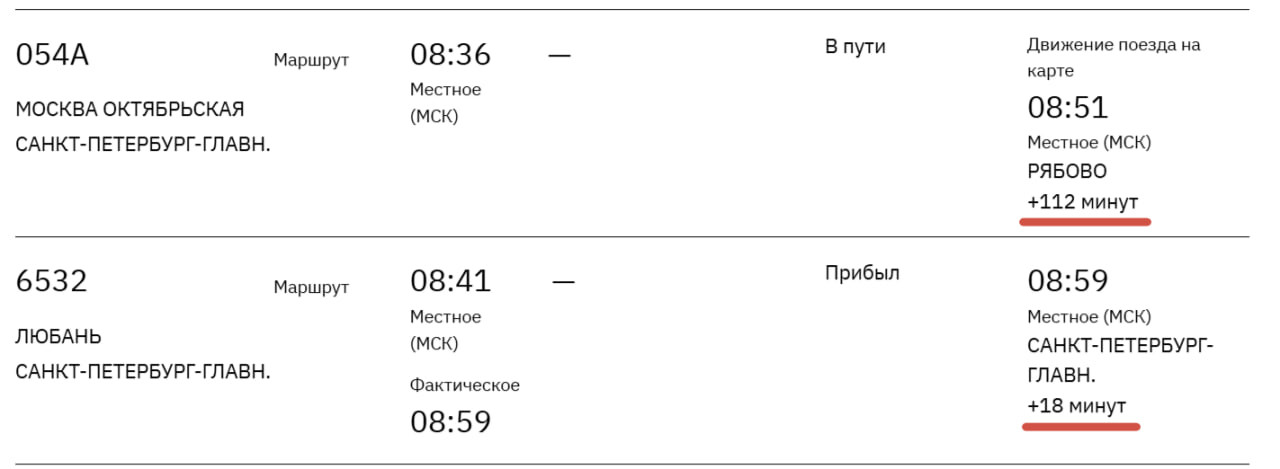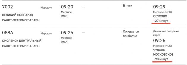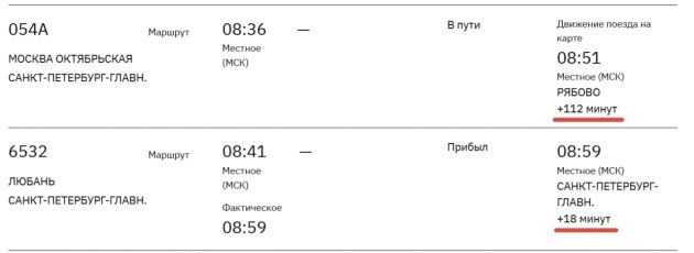 Судя по онлайн табло, на 149 минут задерживается поезд №045Я/046Я Иваново — Петербург, №054А "Гранд-Экспресс" Москва — Петербург и другие.