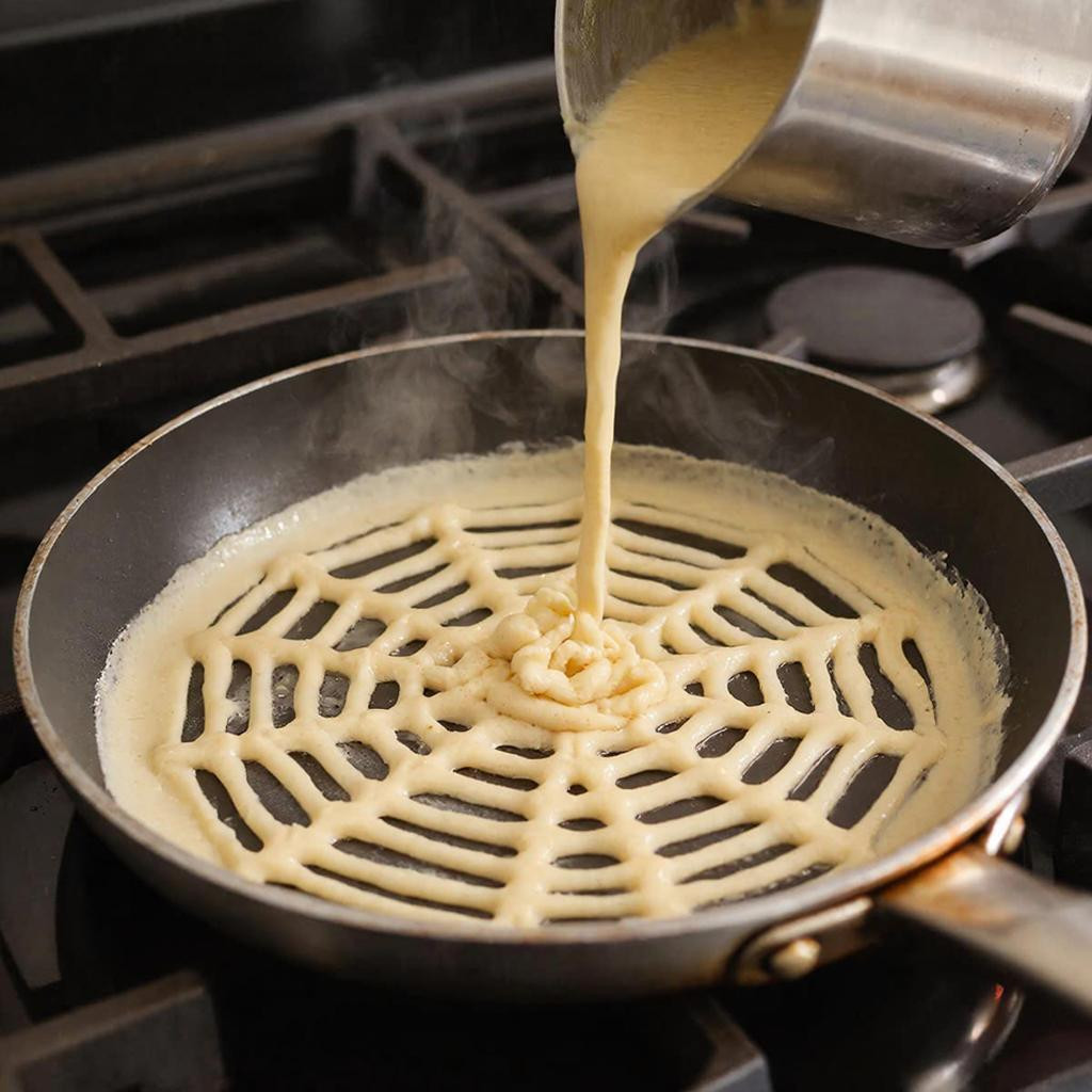 Способ приготовления предполагает свободное вращение руки над горячим маслом, с распределением теста линиями. Можно сделать в форме паутины или как подскажет фантазия. в принципе, можете просто рисовать любимые пейзажи.