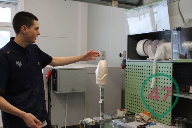 Столь дорогая процедура начинается с банального гипса: сначала на культю наносят гипсовый бинт. Потом на получившийся слепок, его здесь называют "чаша", надевают разогретый листовой пластик. Получается первичная гильза, на которой боец учится ходить. Если все устраивает, делается уже постоянная гильза из карбона. Мне дали подержать обе – тяжелые. Протез одного бедра весит 7-8 кг. Тяжести добавляет коленный модуль с микропроцессором, зато с ним можно хоть на лыжах, хоть на велосипеде.