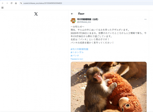 Трагичная судьба детеныша японского макака Панча привлекла внимание пользователей по всему миру. Видео с ним из зоопарка собирают миллионы просмотров и транслируются в СМИ. От него отказалась собственная мама, а в стае его не принимают. Судя по видео, его буквально возят головой об пол. Так что обезьянке приходится прятаться и полагаться только на свою плюшевую игрушку, которая заменяет ему мать. Сотрудники японского зоопарка Ичигава беспокоятся о его судьбе. Макака перевели на искусственное вскармливание и постепенно пытаются ввести в социум. Обо всех изменениях его жизни рассказывают в официальном аккаунте зоопарка Ичигава в соцсети X.