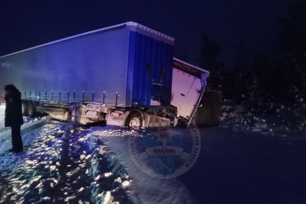 Этот большегруз также выехал на полосу встречного движения и столкнулся с "КамАЗом". Оба габаритных автомобиля съехали в кювет.