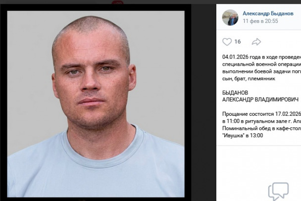 "Четвертого января 2026 года в ходе проведения специальной военной операции при выполнении боевой задачи погиб любимый сын, брат, племянник Быданов Александр Владимирович", - говорится в сообщении родственников на странице в соцсети.