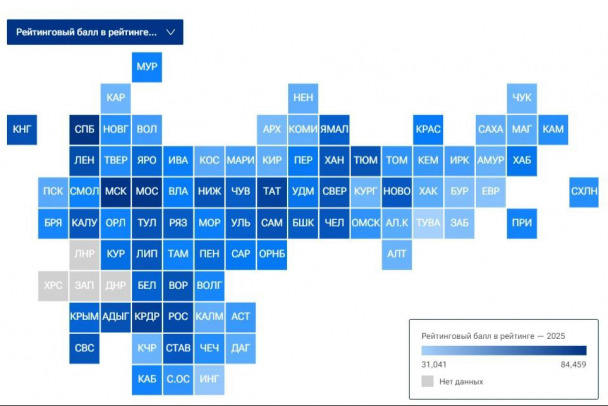 Первые три позиции у Москвы, Петербурга и Московской области, они не менялись с позапрошлого года. Далее идут Краснодарский край, Татарстан и Ростовская область. С последней Ленобласть поменялась местами в 2025 году, если сравнивать с 2024 годом. Последние пять мест у Забайкальского края, Бурятии, ЕАО, Ингушетии и Тывы.