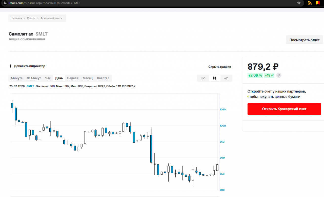 Ценные бумаги девелопера торгуются на Московской бирже (MOEX). Рынок отреагировал повышением. Накануне заявления главы "Самолета" одна обыкновенная акция продавалась за 846,4 рублей. На открытии торгов 24 февраля - за 847,6 рублей, к закрытию биржи - 861,2 рубля. Утром 25 февраля торги открылись с ценой в 860 рублей за акцию. К 13:40 стоимость поднималась до 879,2 рублей.