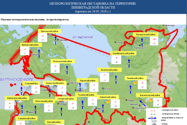 Как сообщает ГУ МЧС России по Ленинградской области, 26 февраля в 47-м регионе ожидается облачная погода. Ночью – с прояснениями, местами небольшой снег. Днем засыплет сильнее, особенно на западе. Восточные районы переживут стихию поспокойнее. Местами по всему региону ожидаются метели.