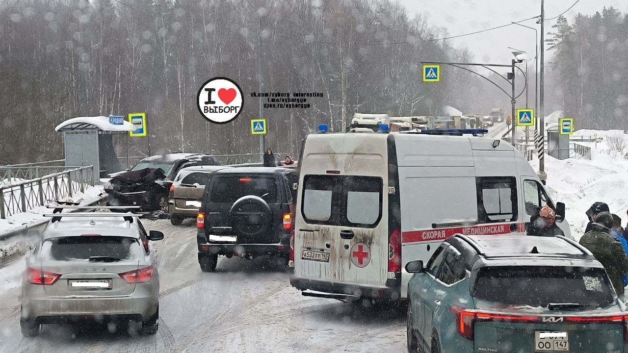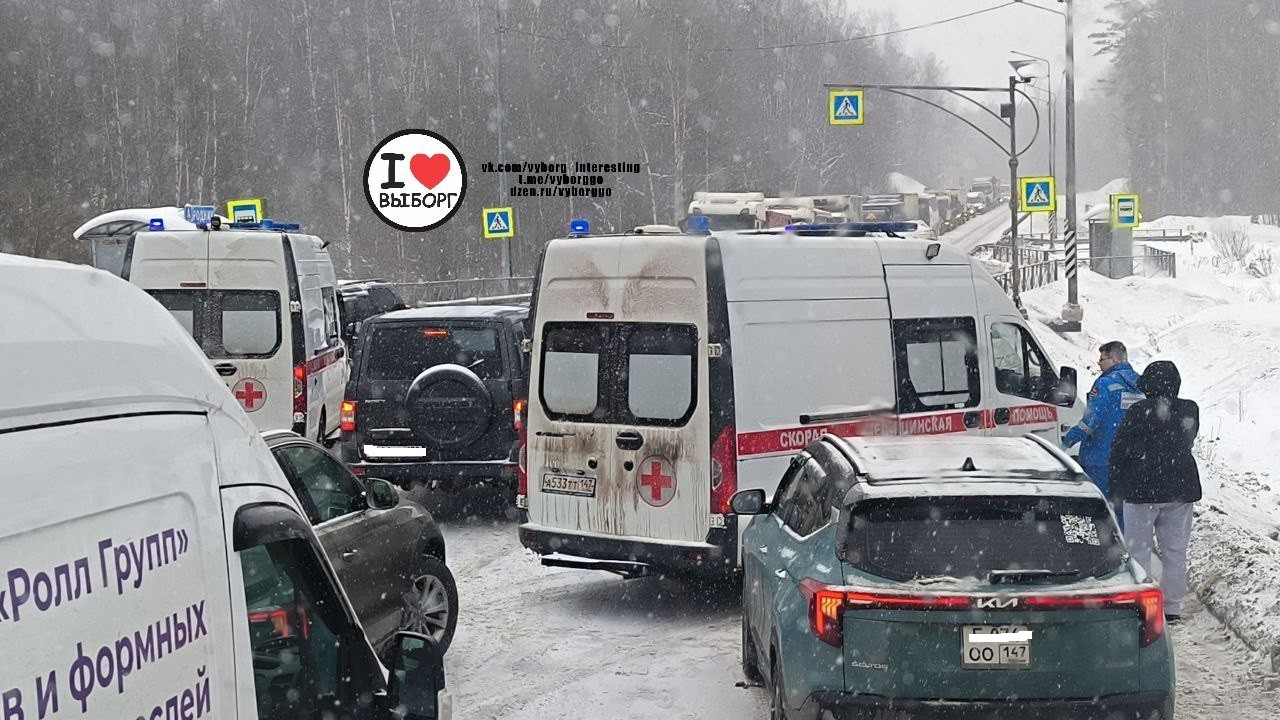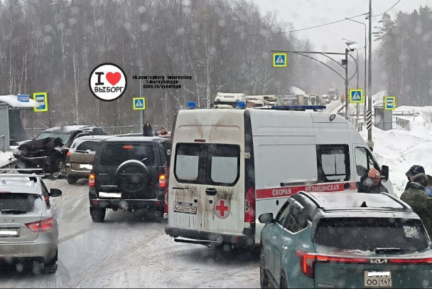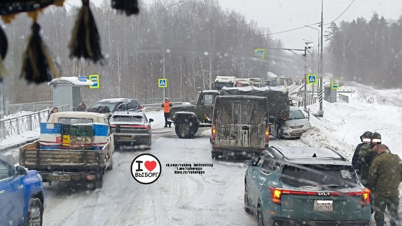 Грузовик с людьми в форме и два легковых авто столкнулись на дороге в Выборгском районе Ленинградской области. На участке организовано реверсивное движение.