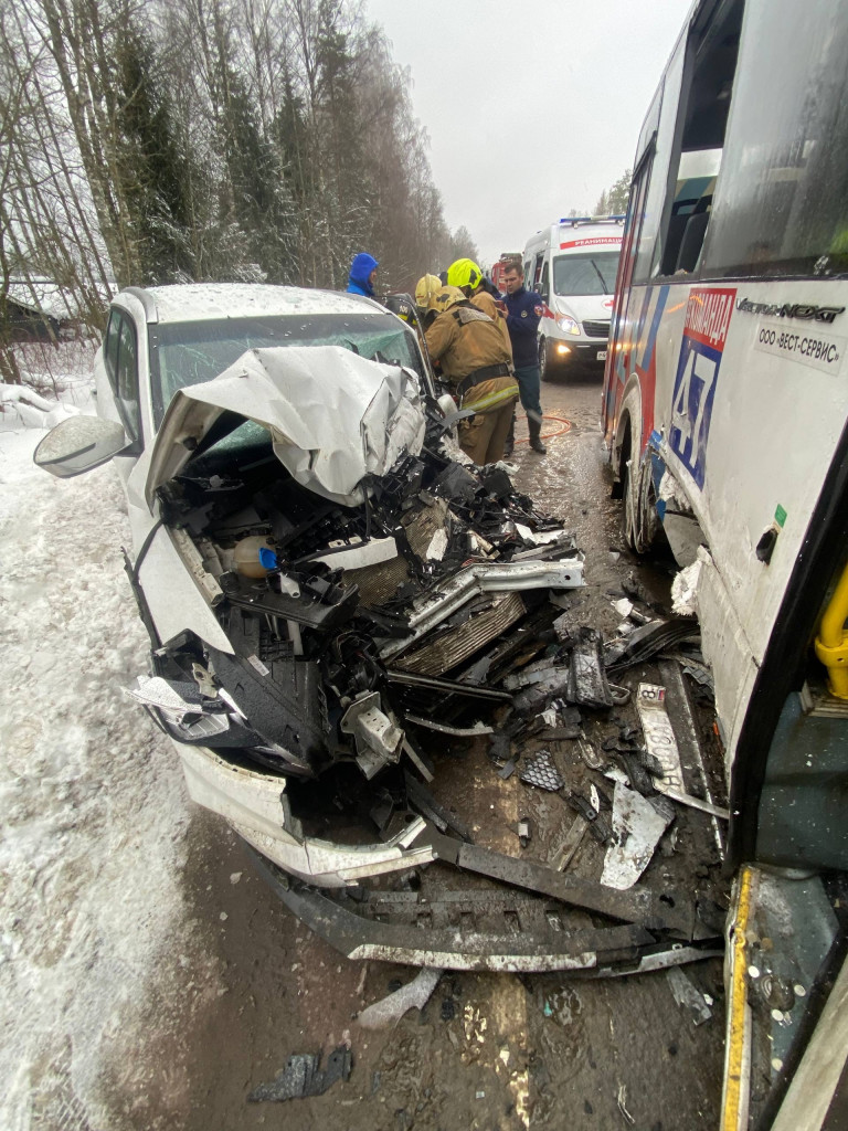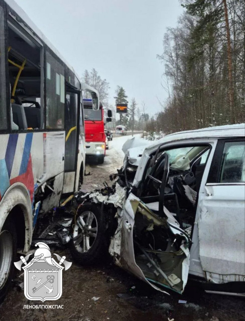В момент ДТП в автобусе был только шофер, он не пострадал. Травмы получили водитель и пассажир кроссовера, обоих увезли в больницу Токсово. Водителя из машины деблокировала дежурная смена 100-й пожарной части районного отряда Леноблпожспаса.