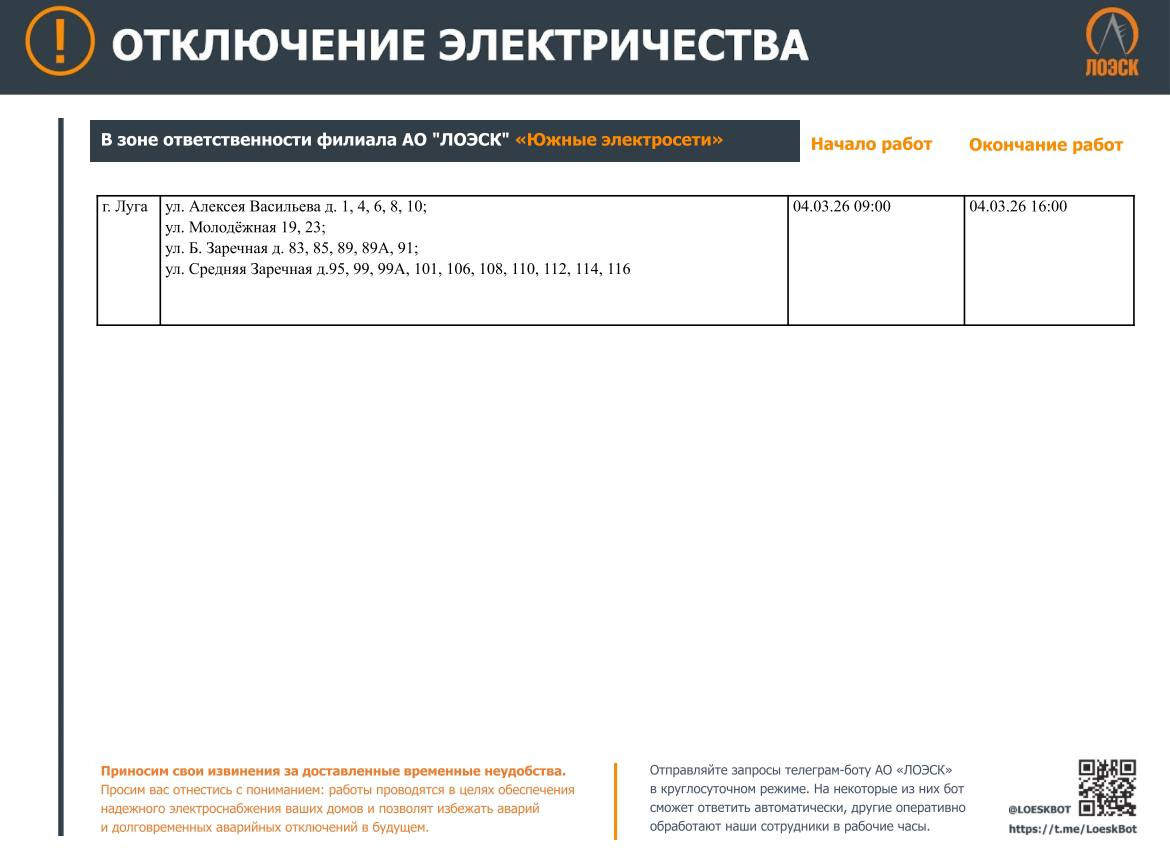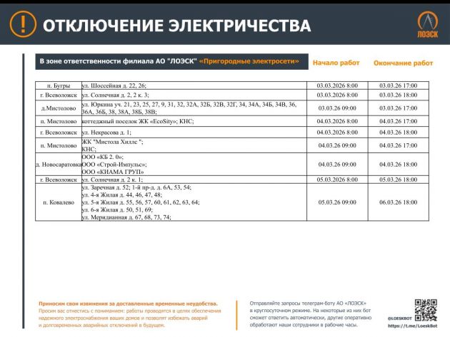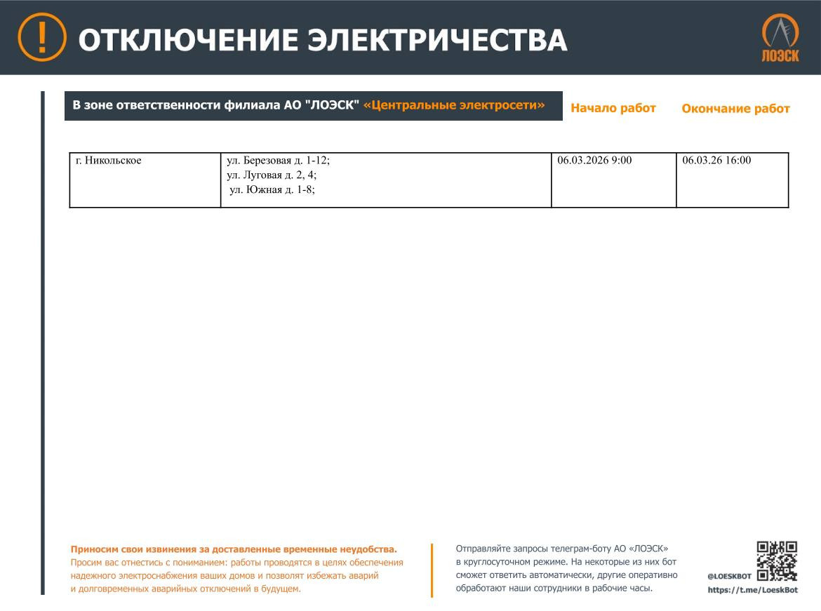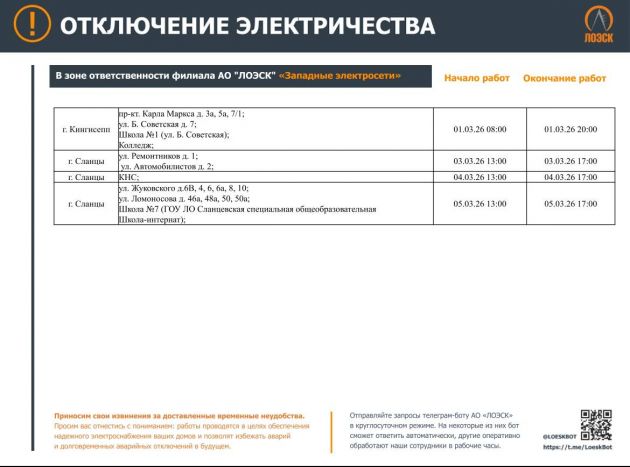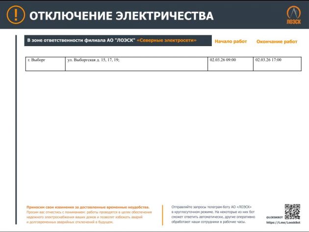 Судя по графику отключений, все работы будут вестись одним днем, то есть электричество должно вернуться спустя несколько часов после отключения. Впрочем, ЛОЭСК отмечает, что в графике возможны изменения.
