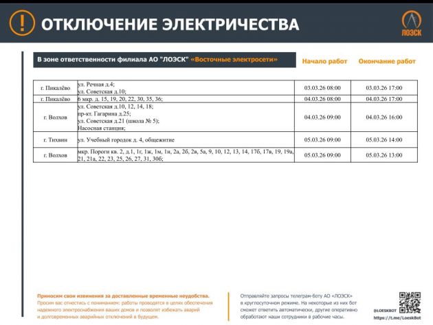 Как сообщает ЛОЭСК, со 2 по 8 марта возможно прекращение подачи электроэнергии во время работ на электрооборудовании. Речь об адресах в Пикалево, Волхове, Тихвине, Кингисеппе, Сланцах, Выборге и нескольких населенных пунктах под Всеволожском, в том числе в нем самом.