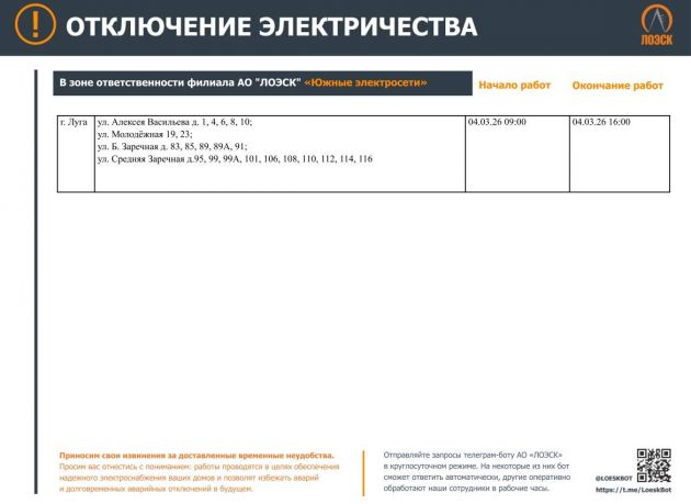 ЛОЭСК сообщает о работах на электрооборудовании в первую неделю марта. Света может не быть до самого вечера.