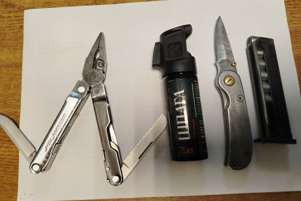 Мужчина принес в сумке травматический пистолет и патроны 45 калибра, нож, газовый перцовый баллончик, мультититул с пассатижами, отверткой и ножницами. При этом шел он на заседание в качестве свидетеля.