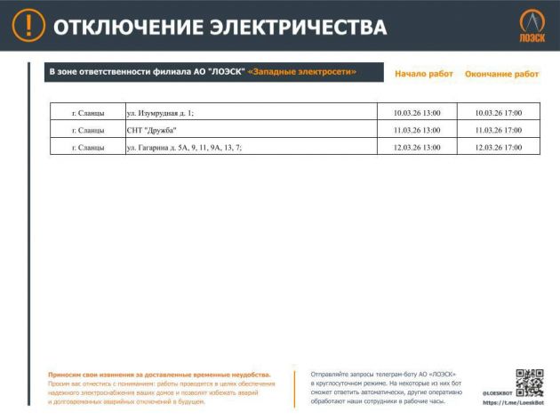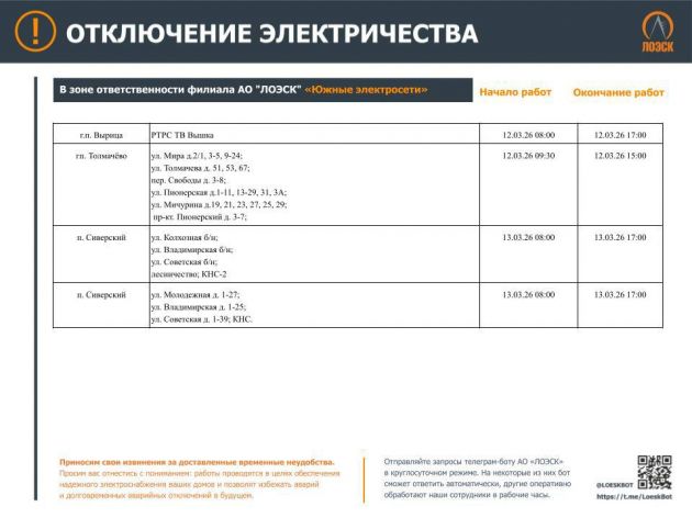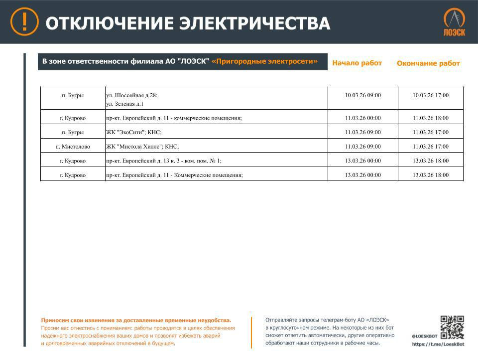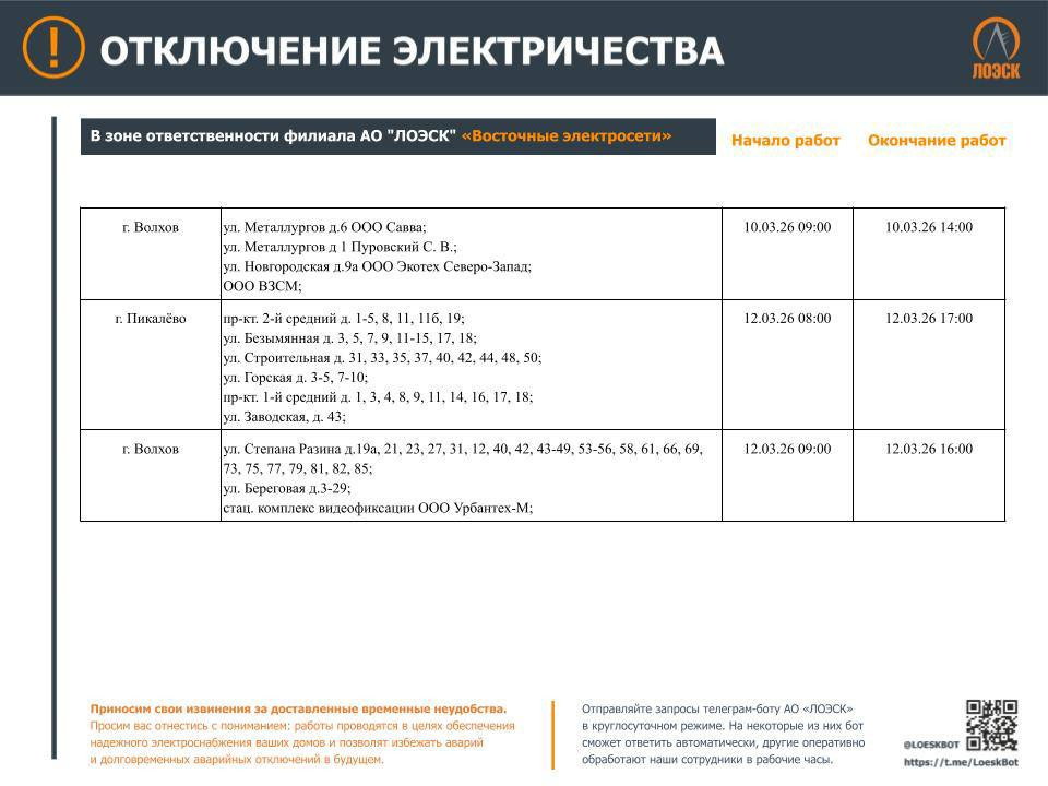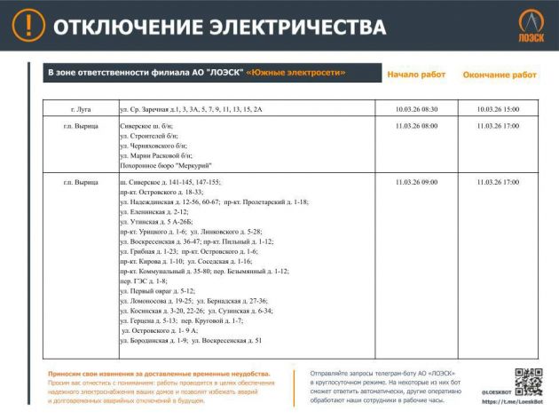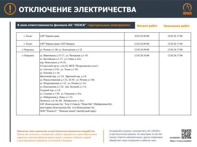 Чтобы отключения не застали Вас врасплох. График плановых отключений энергоснабжения до 15 марта опубликовал ЛОЭСК.