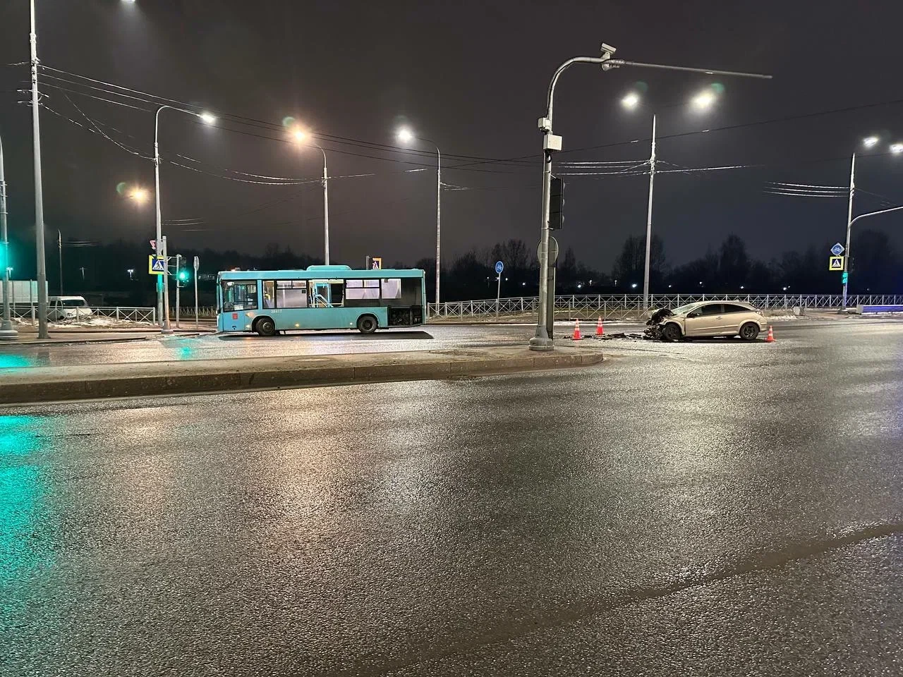 Легковушка и автобус разлетелись на встречке на юге Петербурга. Пострадали два человека, один из них позднее умер в больнице.