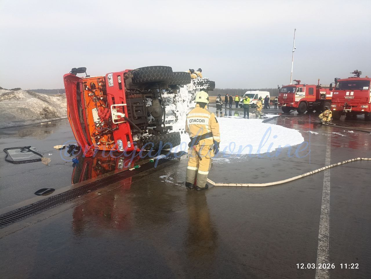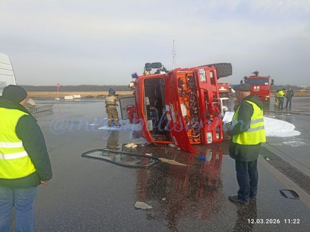 По информации 47news, днем 12 марта во время учений на территории аэропорта Пулково опрокинулась пожарная машина. Этот момент попал на видео. При повороте транспорт занесло, он лег на бок.