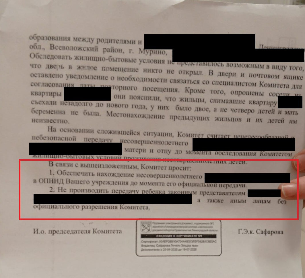 Интересно и то, что в одном из документов органов опеки, распространяемом в соцсетях матерью, сказано, что передачу ребенка родителям считают "нецелесообразной и небезопасной," – бумага оформлена как письмо комитета на имя заведующей отделением больницы.
