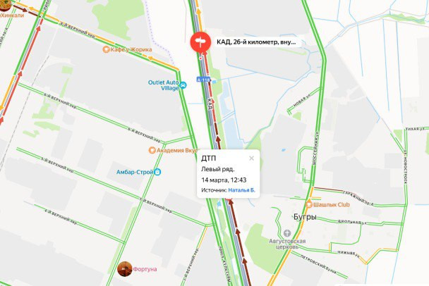 По  данным сервиса Яндекс. Пробки, затор на этом участке КАД достиг уже 2 с половиной километров. Здесь преобладает бурый цвет, что говорит о том, что движение очень затруднено.