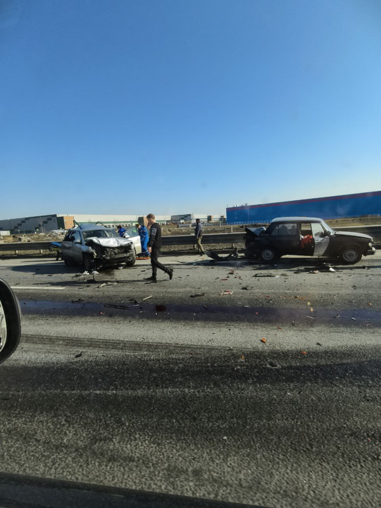 Аварию у складского комплекса зафиксировали камеры очевидцев. На фотографиях видно, что столкнулись "Жигули" и иномарка. Автор кадров сообщает, что машины снесли барьер у обочины и  зацепили проезжавшую фуру.