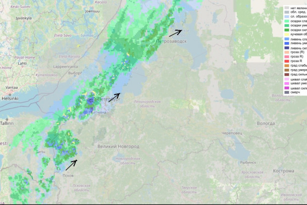 На ней видно наступление облачности на регион. Правда, судя по тому, что в центре Петербурга капать уже практически перестало, сильных осадков ожидать не стоит.