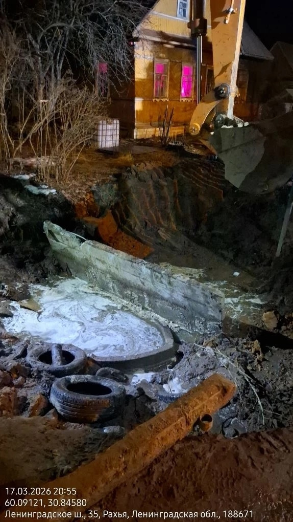 В ГУП "Леноблводоканал" уточнили, что повреждение трубопровода обнаружено 16 марта. Участок чугунной трубы проложен в зоне торфяников, грунты серьезно заполнены водой.