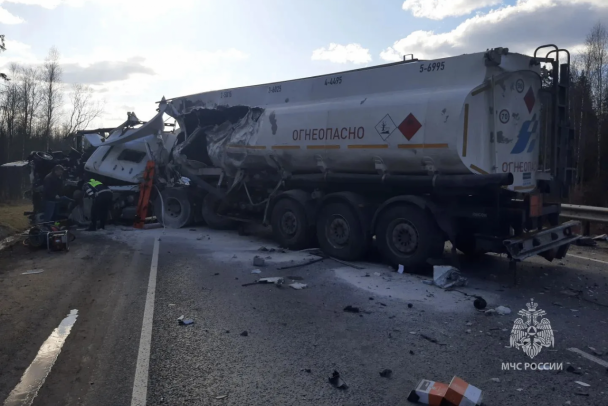 По данным ГУ МВД, 24 марта около 16:30 у грузовика JAC во время движения под управлением 65-летнего мужчины лопнуло переднее колесо. Машина выехала на полосу встречного движения и столкнулась с бензовозом Sitrak. Участником аварии также стала Kia Rio - легковая иномарка двигалась следом за грузовиком с топливом.