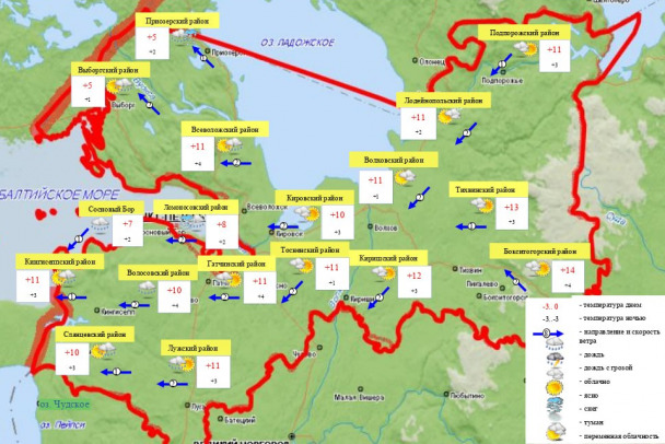 Судя по метеокарте, теплее всего будет в Бокситогорском районе, хотя облачно и там. Дожди пройдут во многих районах, проще посмотреть, где они не ожидаются. Это Тосненский, Киришский, Волховский, Тихвинский, Лодейнопольский и Подпорожский районы.