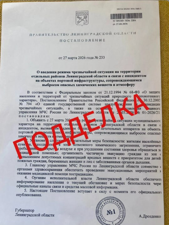 Судя по фото, в поддельном документе говорится, что с 27 марта объявляется режим ЧС на территории отдельных районов якобы "в связи с инцидентом на объектах портовой инфраструктуры, сопровождающимся выбросом опасных химических веществ в атмосферу". Также здесь говорится о том, чтобы ограничить пребывание на открытом воздухе, из загрязненных зон организовать частичную эвакуацию.