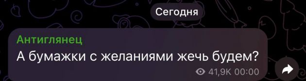 Крупный канал со светской хроникой "Антиглянец" использовал что-то наподобие черного юмора, предложив устроить "антиновый год", попрощавшись с надеждами сохранить привычный уклад сжиганием бумажек с желаниями. В то же время многие серьезно проверяли связь, в том числе журналистка Ксения Собчак.
