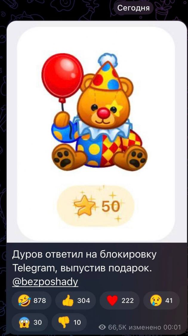 Что касается официальных комментариев, то Павел Дуров к 1 апреля без каких-либо намеков выпустил виртуальную игрушку-подарок в виде мишки-клоуна. Еще в начале февраля основатель платформы заявил, что ограничение доступа к Telegram обусловлено желанием перевести граждан в государственное приложение и привел аналогии с Ираном, где 8 лет назад запретили мессенджер.