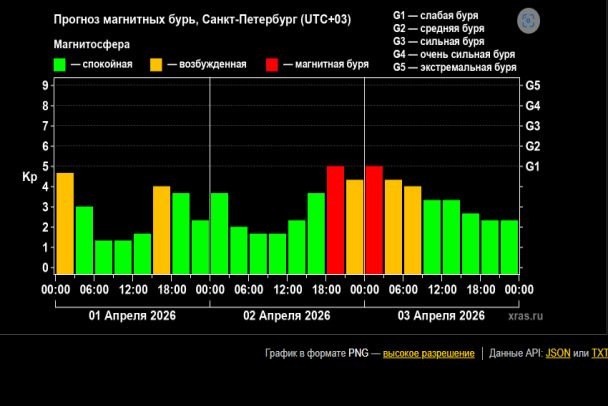 Как сообщается на сайте Лаборатории солнечной астрономии ИКИ и ИСЗФ 1 апреля, месяц начинается магнитными бурями. Судя по прогнозу, с шести часов вечера 2 апреля возможно буря уровня G1 (всего уровней пять, где G1 — слабая буря, а G5 — экстремально сильная). Возмущения продлятся до трех часов ночи 3 апреля.