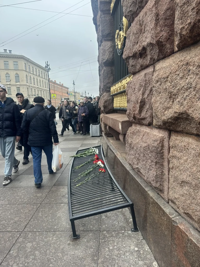 Петербуржцы возлагают цветы к мемориальной доске, установленной на станции "Технологический институт" в 2020 году. Троицкий собор организовал панихиду по погибшим.