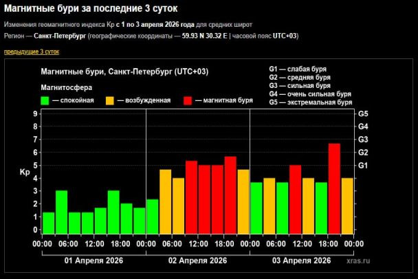 Метеозависимых предупреждают, что обстановка полностью стабилизируется не раньше воскресенья. В субботу буря продолжится — согласно прогнозу, 4 апреля возмущения будут продолжаться с полуночи до полудня. Они достигнут уровня G2, то есть средней бури (всего уровней пять, где G1 — слабая буря, а G5 — экстремально сильная).