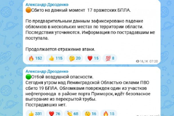 Ленобласть оказалась под очередной атакой украинских БПЛА. Есть повреждения нефтепровода в районе порта Приморск и падение обломков на территории области.