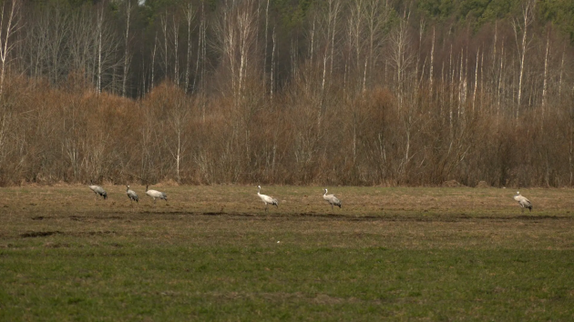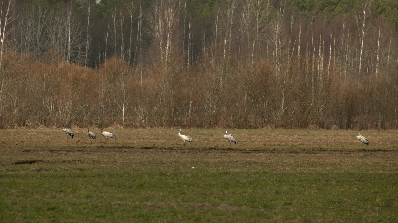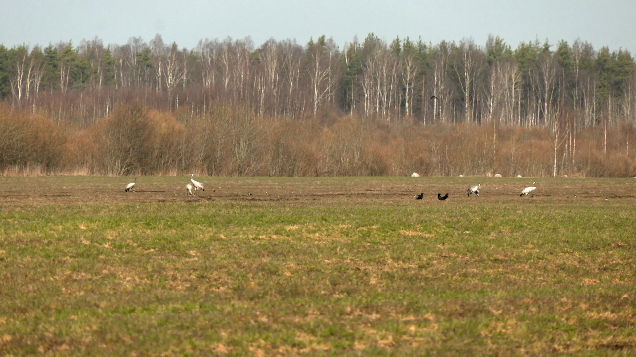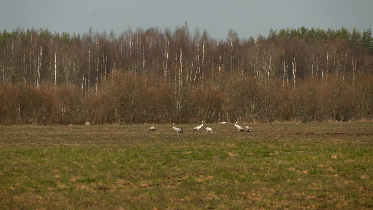 "В наш регион из Африки начали возвращаться эти грациозные, величественные птицы. В поле пасутся шесть журавлей — с большой вероятностью, это три пары. Ведь журавли — преданные семьянины, и союз образуют на всю жизнь. Внешне самец и самка не отличаются, самец лишь немного крупнее", - поясняет Глазков.