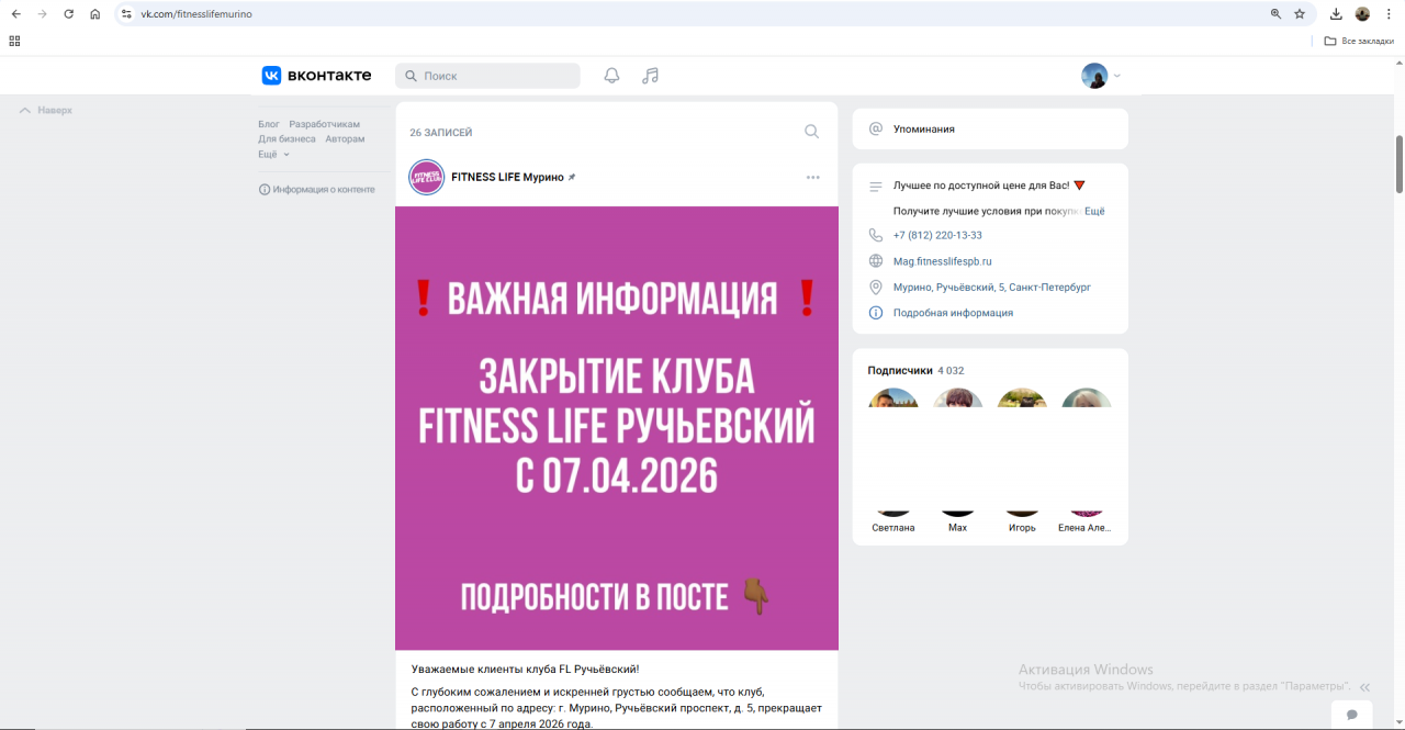 47news попытался напрямую связаться с представителями фитнес-клуба. Номер телефона муринского филиала зала оказался отключен. В отделе продаж перенаправили на директора двух залов – правда, уже в Кудрово. Телефон молчал, но в отделе продаж пообещали передать контакт корреспондента директору. На момент публикации звонка не поступило.