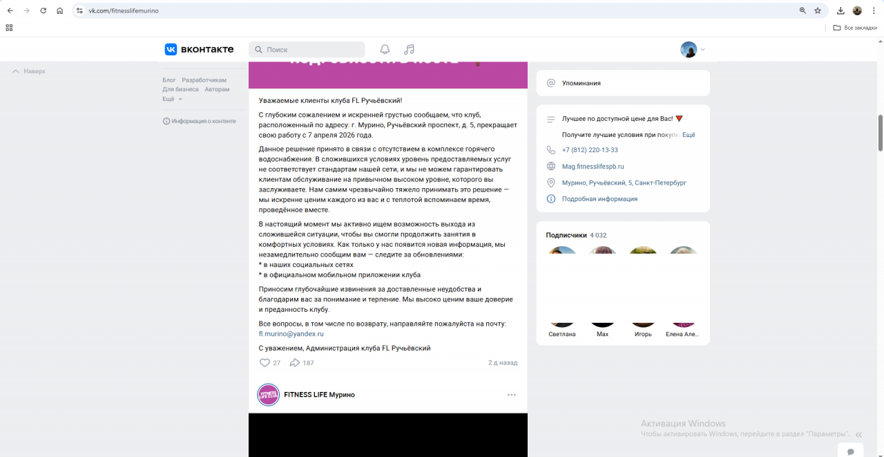 Заметим, что еще два месяца назад клиентов предупреждали, что 1 марта 2026 года цены на абонементы повышаются. Решение было названо непростым, поскольку компания стремилась "создать еще более комфортные условия". По их мнению, "изменение цены – шанс к улучшению условий". Среди причин повышения прайса, помимо обновления оборудования и "безупречной чистоты", указано обеспечение профессионального обслуживания "на неизменно высоком уровне". Можно предположить, что в эту категорию входило и нормальное водоснабжение.