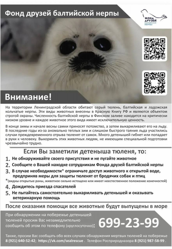 Местных жителей просят: если они заметят ластоногого на берегу Сестрорецкой губы, писать в фонд или звонить по номеру телефона 699-23-99.