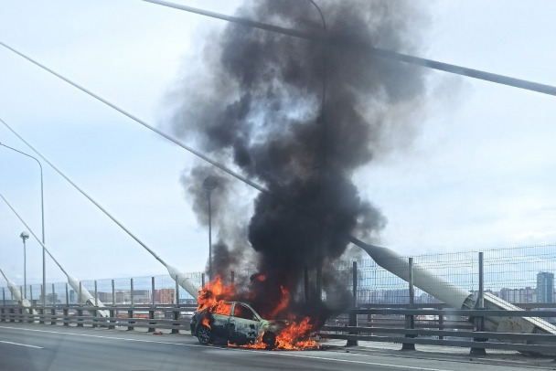 Как сообщает ГУ МЧС по Санкт-Петербургу, сигнал о пожаре на вантовом мосту поступил в 14:51 12 апреля. Загорелась легковая Mazda на внешнем кольце. На кадрах видно, что пламя полностью охватило автомобиль.