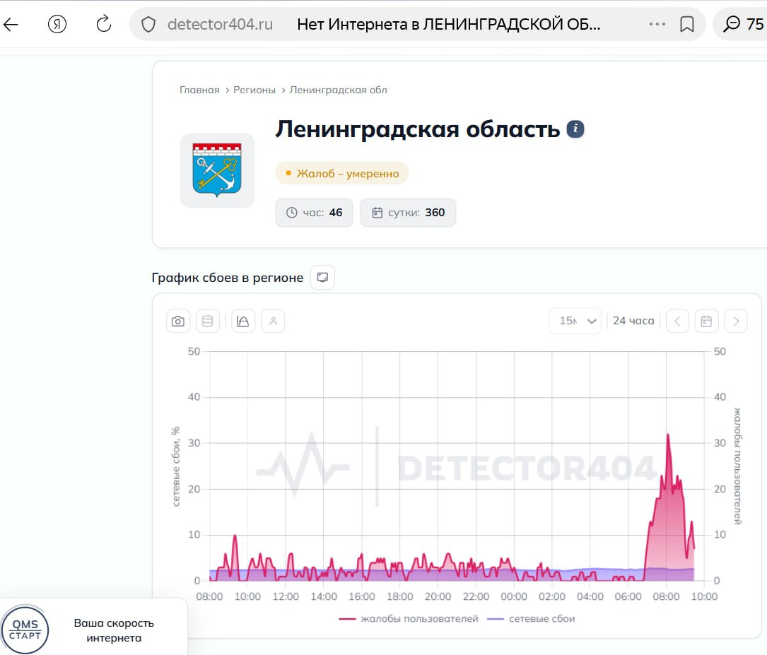 В Ленинградской области утром 13 апреля наблюдаются сбои в работе интернета, фиксирует сервис Downdetector404.