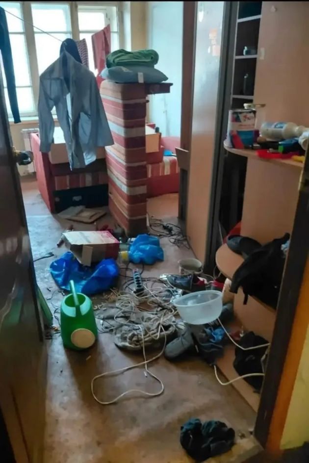 На кадрах можно увидеть беспорядок и грязь в квартире, мусор, немытую посуду, а также пустые бутылки.