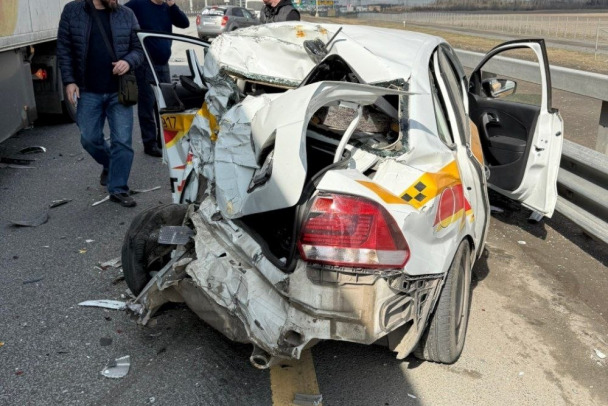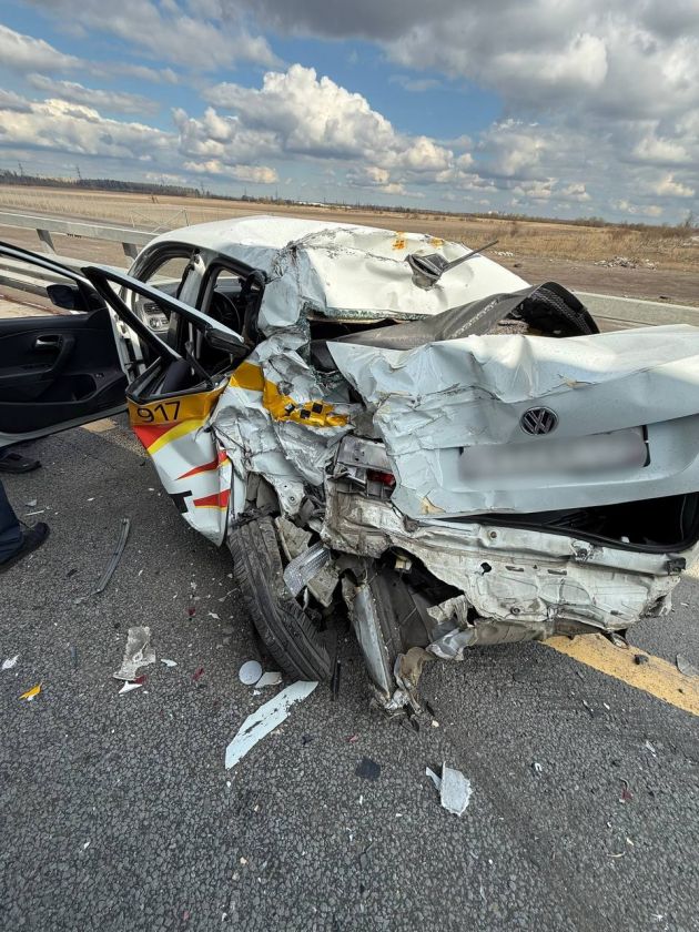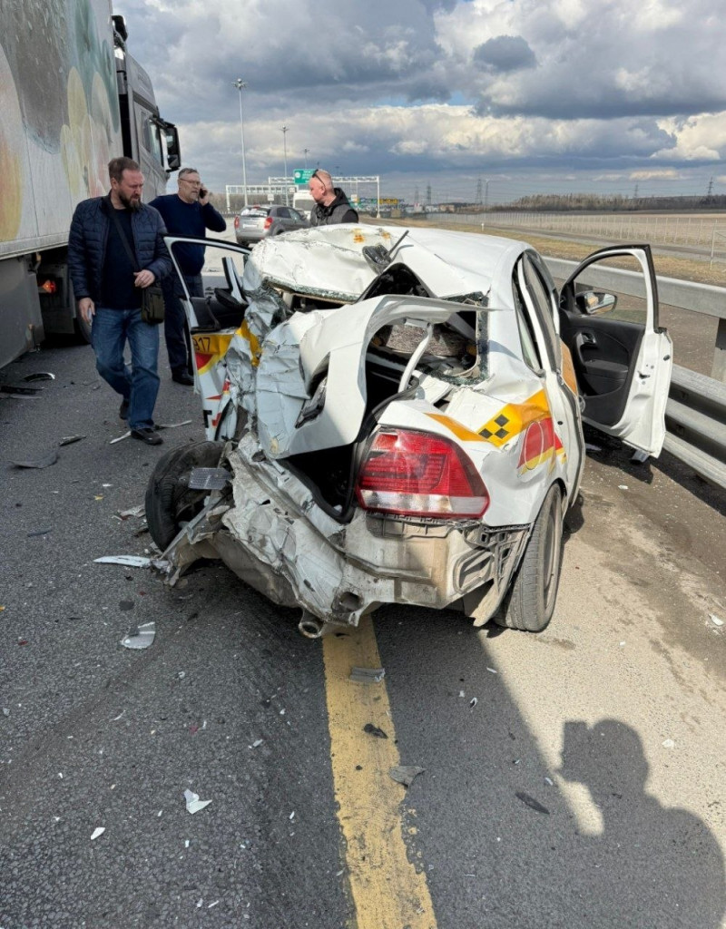 По предварительным данным 47news, 13 апреля произошла авария на северном участке ЗСД перед съездом на КАД. Судя по фото, легковое такси искорежило при ударе фуры.