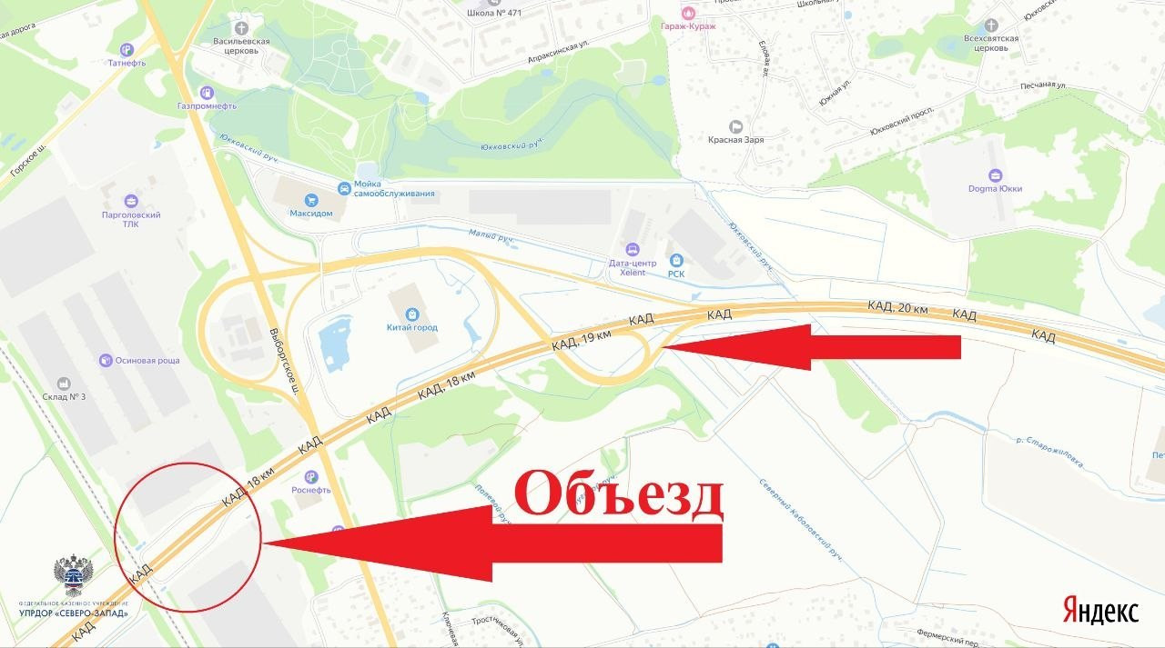 "Движение по другим съездам транспортной развязки будет осуществляться в штатном режиме. Объезд перекрытого съезда будет осуществляться через разворотную петлю (с внешнего на внутреннее кольцо КАД) расположенную на 17 километре в районе складов временного хранения ООО "Парголовский ТЛК",-уточнили дорожники.