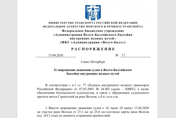В связи с обрушением судоходного пролёта моста Строителей на реке Волхов ФБУ "Администрация "Волго-Балт" ввело запрет на движение судов на акватории в границах места происшествия. Согласно опубликованному приказу судоходство невозможно на участке в 700 метров — с 25,1 км по 25,8 км на реке Волхов. Запрет вступил в действие в 16 часов 40 минут 13 апреля и продолжает действовать.