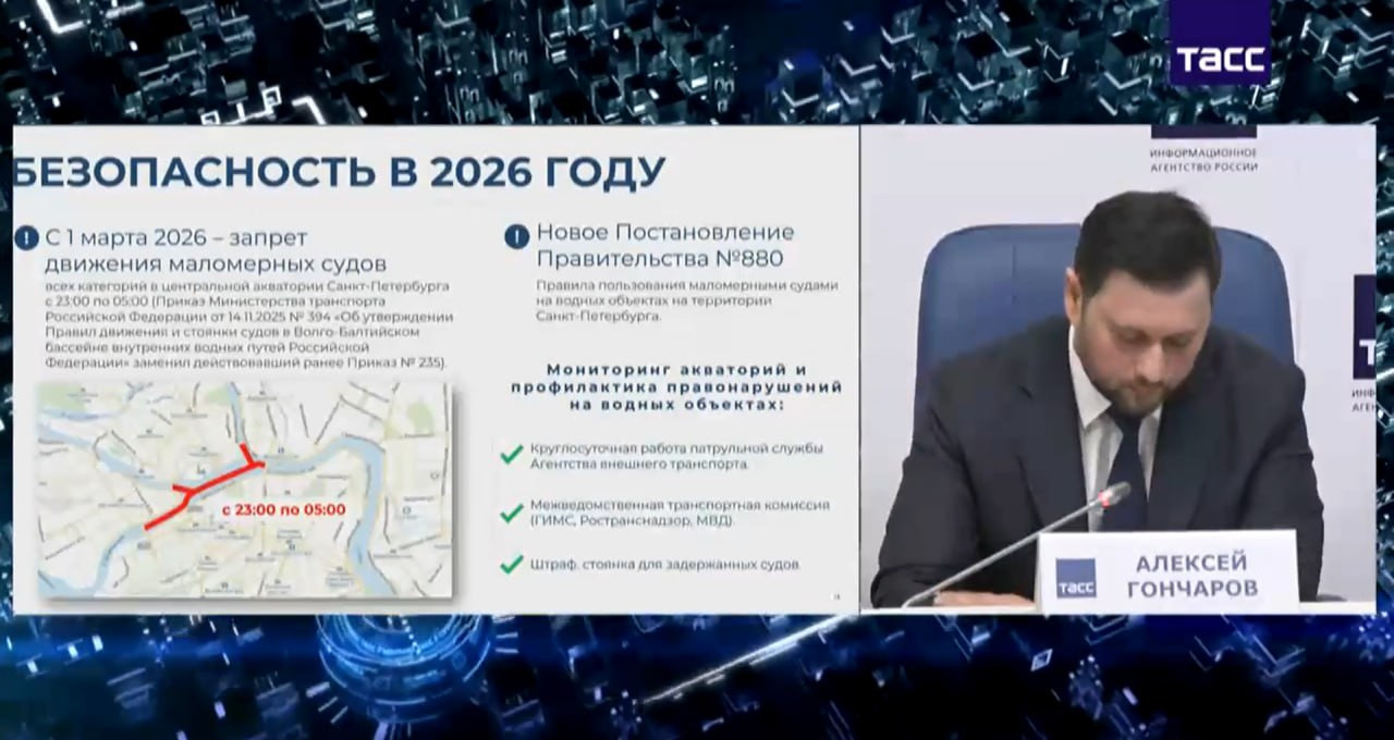 "С 1 марта действует запрет для движения маломерных судов всех категорий в центральной акватории Санкт-Петербурга с 23.00 до 5.00 утра", - сказал Гончаров 15 апреля на пресс-конференции ТАСС, посвященной началу навигации.