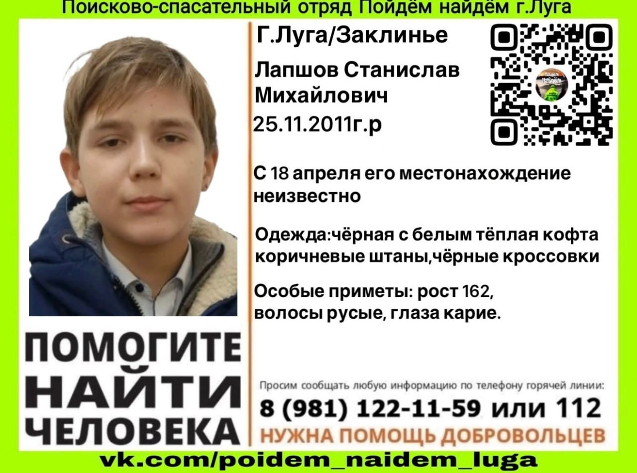 Как сообщает ПСО "Пойдем найдем г.Луга", с 18 апреля ничего не известно о местонахождении 14-летнего школьника из деревни Заклинье. Юношу ищут по всему Лужскому району.
